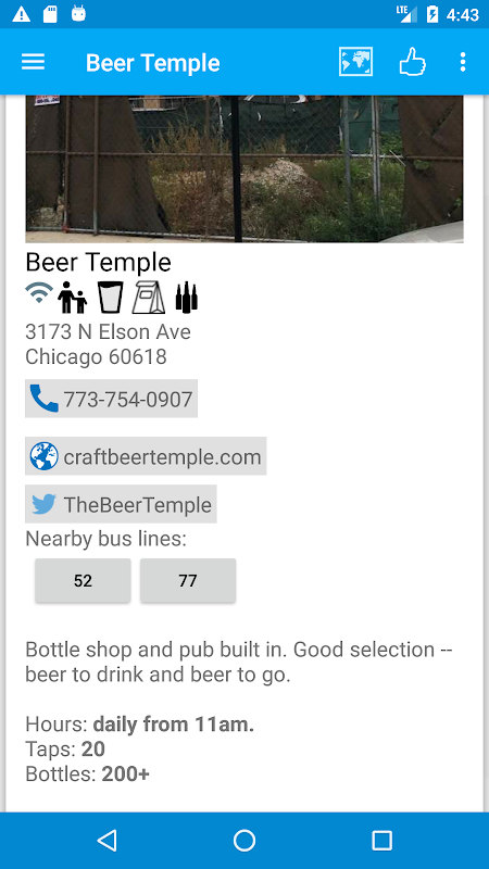 هر ورودی شامل بررسی، نزدیک ترین حمل و نقل عمومی، اطلاعات تماس، وب سایت و توییتر برای هر میخانه است. فید توییتر خوراک برای اخبار را بدون خروج از برنامه بررسی کنید. نقشه محل میخانه و همچنین بارها در نزدیکی فهرست نشان می دهد.