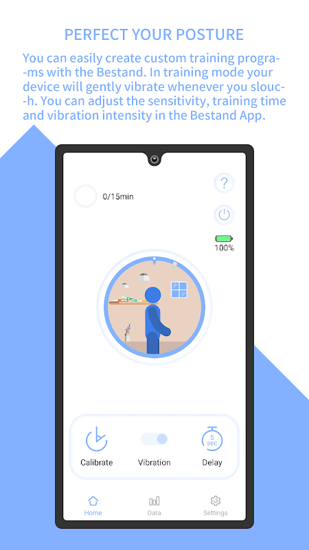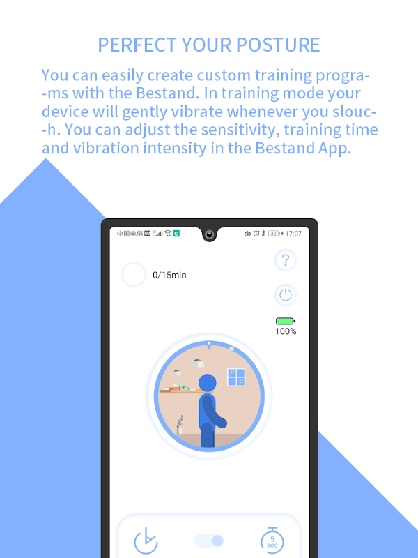 1.Perfect Your Posture: You can easily create custom training programs with the Bestand. In training mode your device will gently vibrate whenever you slouch. You can adjust the sensitivity, training time and vibration intensity in the Bestand App.