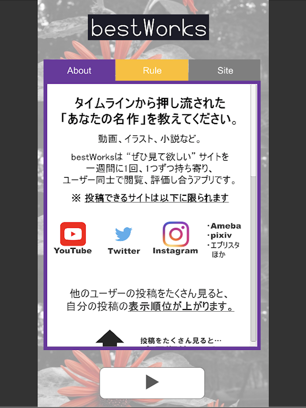 bestWorksは“ぜひ見て欲しい”サイトを、一週間に1回、1つずつ持ち寄り、ユーザー同士で閲覧、評価し合うアプリです。