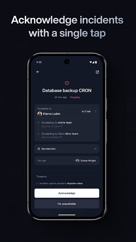 هشدارهای حادثه را از طریق کانال دلخواه خود دریافت کنید: اعلانهای فشار، پیامک، تماسهای تلفنی، ایمیلها، پیامهای Slack یا Teams. این حادثه را با یک کلیک روی تلفن خود تأیید کنید تا به بقیه اعضای تیم اطلاع دهید که از آن مراقبت می کنید.