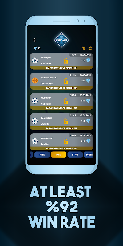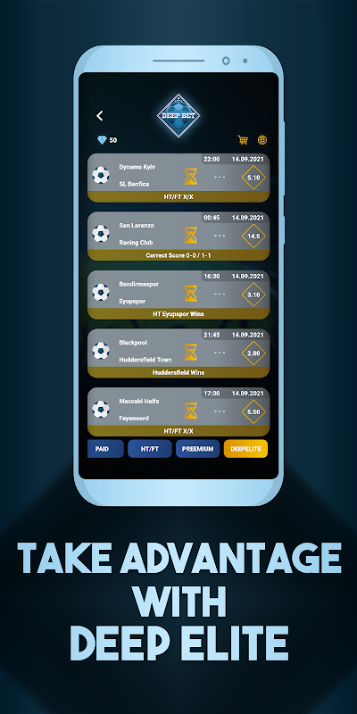این برنامه شامل بخشهای رایگان ، پولی ، Ht/Ft ، Premium و Deep Elite است که روزانه به روز می شوند. میزان برنده شدن نکات ارائه شده توسط تیم تحلیلگر Deep Bet بین 90 تا 98 درصد است. در بخش رایگان ، مسابقات بین شانس 1.30 تا 1.90 به اشتراک گذاشته می شود ، در حالی که پیش بینی ها در بخش های پولی و اشتراک بین 2.00 تا 25.00 در هر مسابقه است. امکانات؛