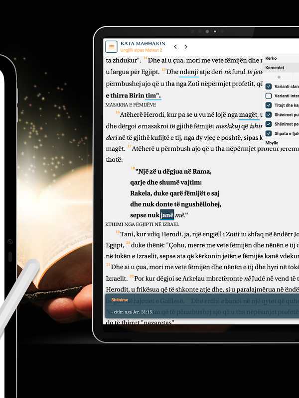 برای بازگشت به Dhiates از Vjetër (BV) استفاده از OSHB (کتاب مقدس عبری باز)، که پشتیبانی در Tekstin Mazoretik sipas Kodikut të Leningradit. در حالی که برای Dhiatën e Re (BR)، متن اصلی UGNT (UnfoldingWord یونانی عهد جدید)، i cili دنبال استاندارد و UBS و Nestle-Aland است. در واقع، تفاوت آن مشخص است.
