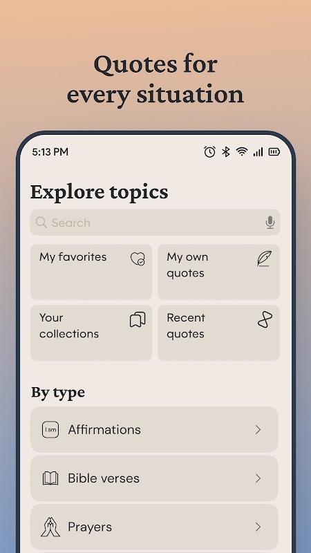 مجموعههای شخصیسازی شده از متنهای مورد علاقه خود را ایجاد کنید، یادآورهای روزانه را در زمانهایی که مطابق با برنامهتان است تنظیم کنید، و از بین تمها و پسزمینههای مختلف متناسب با سبک خود انتخاب کنید. حتی آفلاین، محتوای ذخیره شده شما در دسترس باقی می ماند، بنابراین بازتاب معنوی همیشه فقط با یک ضربه فاصله دارد.