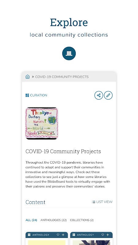 BiblioBoard، در همکاری با کتابخانه شما، به ارائه جامعه خود به ابزارهای قدرتمند برای ایجاد، اشتراک گذاری و کشف محتوای محلی اختصاص یافته است. همکاران شما در حال حاضر دسترسی شما به مجموعه های مورد علاقه خود را توسط جامعه خود دارند.