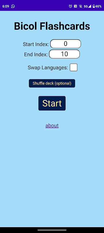 هدف این برنامه کمک به شما در حفظ چند عبارت رایج و لغات مفید در زبان Bicol است که با نامهای Bikol، Bikolano یا Bicolano نیز شناخته میشود. برای استفاده از برنامه، به سادگی محدوده کارت هایی را که می خواهید از کل مجموعه استفاده کنید، مشخص کنید. همچنین میتوانید با جابجایی چک باکس با عنوان «تغییر زبانها»، زبانی که ابتدا نمایش داده میشود را تغییر دهید. روی start کلیک کنید و فلش کارت ها در محدوده ای که انتخاب کرده اید مخلوط می شوند. با کلیک بر روی کارت بالای شمع، پاسخ و همچنین حرکت آن به سمت پایین و خارج از مسیر نشان داده می شود. اگر بعد از آشکار شدن کارت دوباره روی آن کلیک کنید، به یک شمع "تکرار" منتقل می شود تا بتوانید بعداً دوباره آن را امتحان کنید.