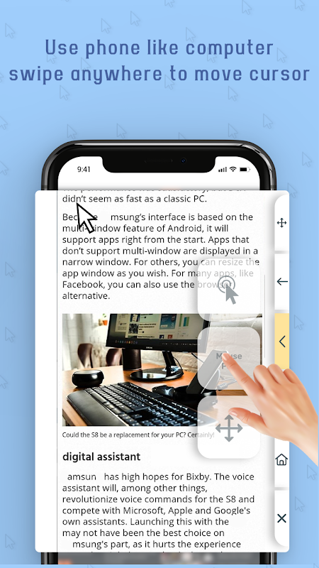 از یک مکان نما/نشانگر موس مانند کامپیوتر برای کنترل آسان گوشی های هوشمند بزرگ مانند سری Note یا تبلت با یک دست استفاده کنید. به طور فزاینده ای، اندازه تلفن همراه در حال افزایش است و کار با تلفن همراه / پد با یک دست را دشوار می کند. Big Phone Mouse Big Screen Mouse Pointer برنامه ای عالی برای کاربران قدرتمندی است که از حرکات کشیدن انگشت برای ناوبری + اشاره گر ماوس استفاده گسترده ای می کنند.