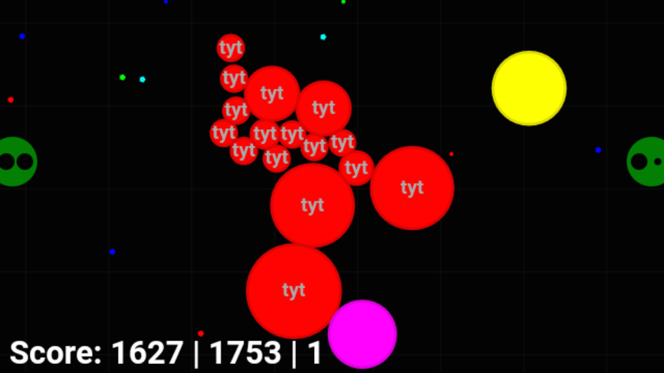 In this game you will have the task that you raised dot are managed by touching the screen anywhere to dot move to that location and eat food, the more dot will eat more food to become larger dot, the game has a lot of big dot and small dot, if you go and eat small dot instead of eating food, your dot will grow faster, and avoid the boom left out otherwise your dot will explosion and small pieces separated and other vulnerable dot to swallow. Alternatively you can press the button to take the split and eat other dot easier or you can give them to other dot or create boom by pressing the button opposite are called nodes created food.