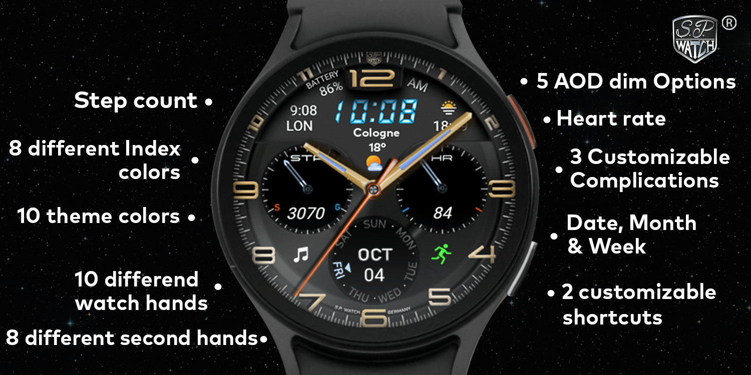 این واچ فیس واقعی قابل تنظیم است، 10 رنگ تم، همراه با 8 رنگ نمایه، 3 پیچیدگی قابل تنظیم، 2 میانبر قابل تنظیم، 10 عقربه ساعت مختلف و 8 عقربه دوم متفاوت را ارائه می دهد. این ساعت به گونه ای طراحی شده است که انعطاف پذیری برای شخصی سازی ظاهر ساعت هوشمند خود را برای مطابقت با سلیقه شخصی کاربران فراهم کند.