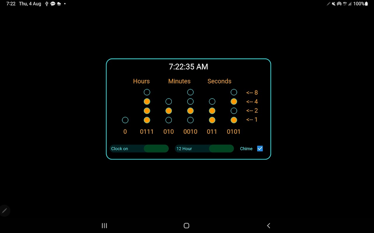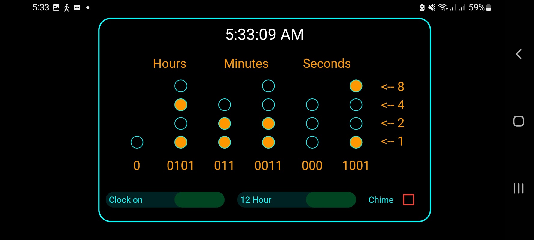 تمام ارقام باینری ساعت با رنگ آبی مشخص شده اند، بیتی که "1" باشد نارنجی و بیتی که "0" باشد سیاه خواهد شد.