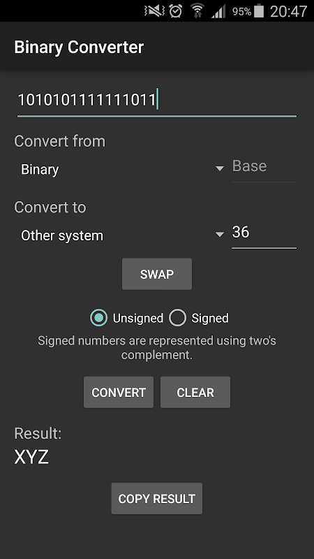 Binary Converter is a simple application that allows you to easily convert numbers between decimal, binary, hexadecimal, octal and any other positional numeral system (currently between base 2 and base 36 inclusive). This app even allows you to convert negative numbers using two's complement.