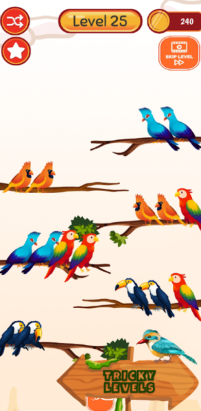 🕊️به هر پرنده ای ضربه بزنید تا پرنده را به شاخه دیگری منتقل کنید و آن را مرتب کنید! قاعده این است که فقط پرندگان از یک گونه و فضای کافی در شاخه ها می توانند یکدیگر را حرکت دهند.