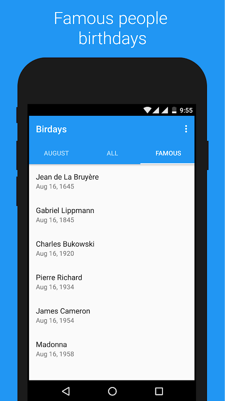 برنامه دارای پایگاه داده ای با بیش از 2000 تاریخ تولد دانشمندان، نابغه ها، نقاشان، افراد مشهور، خوانندگان و بسیاری دیگر از افراد مشهور است. شما خواهید دید که چه کسی امروز تولد یا تولد شما متولد شد.