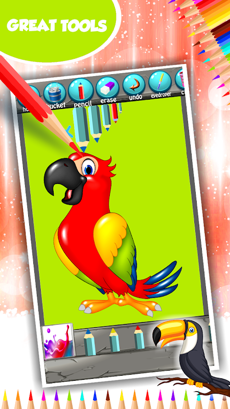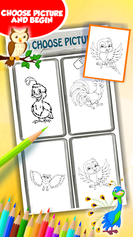 Check out what is new at the market and let the coolest collection of drawings amaze you completely. Download free the latest Birds Coloring Book and have fun while you paint the loveliest winged creatures. Look at the cutest owl and admire it. It is the symbol of the ancient knowledge and wisdom. Apply brilliant shades to the feathers of its wings and make the most spectacular photo out of it. You can later decorate your phone with it in the impressive way. Share then with all of your friends and they will envy you for your newly discovered art skills. Do not hesitate but organize a competition among your kids and the winner will be the one who creates the best picture of a winged creature. Encourage them to express their creativity and have fun. Tell them to tap on the paint bucket with the shade they like and then on the area which they want to cover. It is easy as a piece of a cake. With the top birds coloring application you will be entertained with the awesome illustrations.