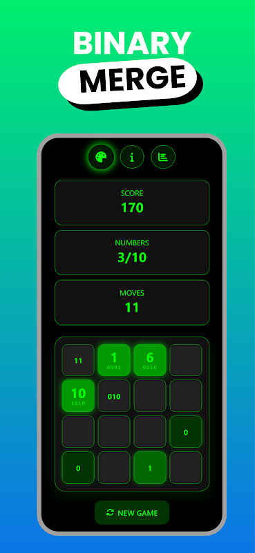 در این پازل اعتیادآور و تاکتیکی، بیتهای دودویی را ادغام کنید تا اعداد ۱ تا ۱۰ را بسازید.