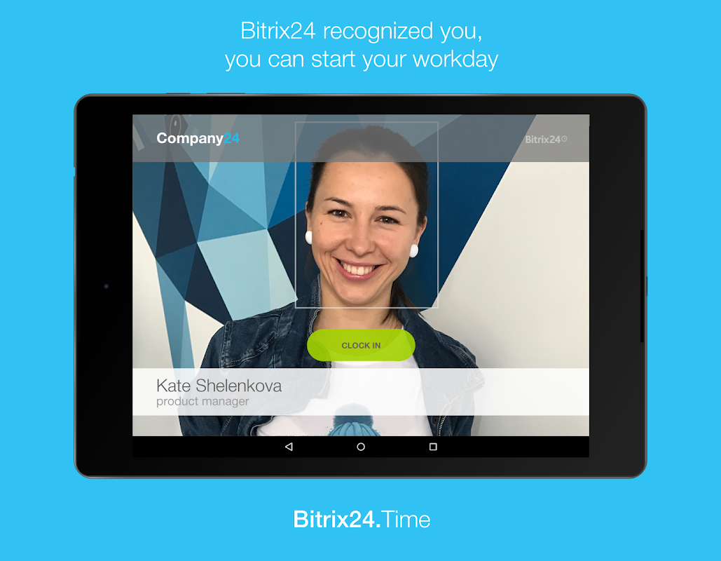 Bitrix24.Time lets you start your workday with a smile – literally. Simply install this face recognition app on a smartphone or a tablet PC and your employees will be able to clock in, out or go on break by smiling to a camera. Because this app randomly asks to perform a specific action (smile, don’t smile, close left or right eye), it can not be easily tricked by simply displaying another employee photograph or a video recording.