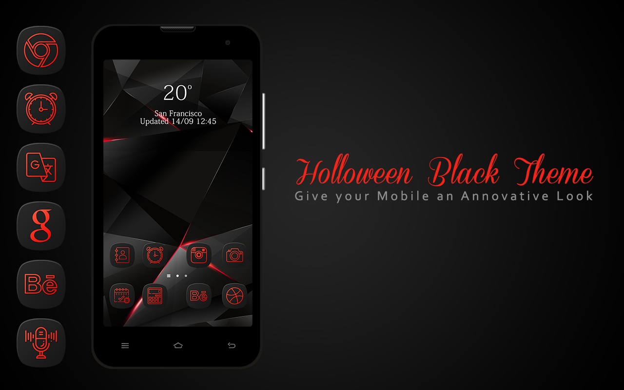تم سیاه برای هالووین دارای تصاویر پس زمینه بسیار جذاب و جذاب و آیکون های برنامه های خیره کننده است. ترکیب آیکون ها و تصاویر پس زمینه آن را جذاب تر و عالی تر می کند.