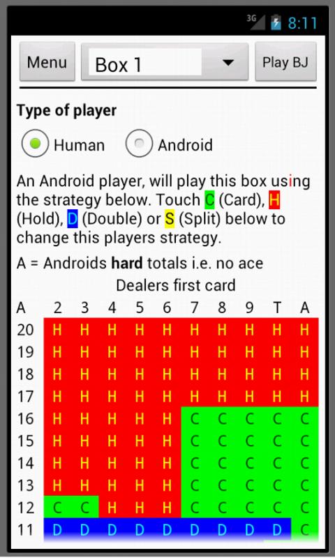 A blackjack table with six betting boxes. You or Android can play a box. How Android plays, bets, counts cards, etc. can be defined by you i.e. when to take a card, hold, split, double; or even whether to use counting when deciding size of bet, can be predefined by you.