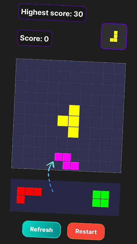 سه تتریس به صورت تصادفی در زیر ظاهر می شوند. آنها را به قسمت بالایی بکشید و بگذارید یک ستون یا یک ردیف افقی برای کسب امتیاز تشکیل دهند. بالاترین رکورد من فقط بیش از 300 امتیاز است. نمی دانم آیا شما می توانید از من پیشی بگیرید؟