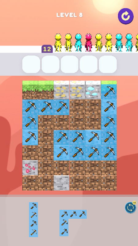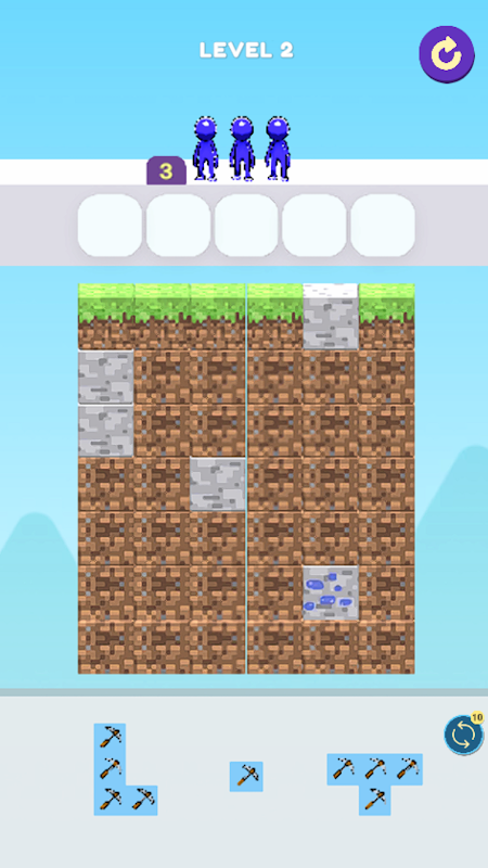 شما با قرار دادن الگوهای تبر روی کاشیهای زمین، Block Miners را بازی میکنید، آنها را مرتب کرده و مطابقت دهید تا یک خط مستقیم از کاشیهای تبر به صورت عمودی یا افقی ایجاد کنید تا در کاشیهای زمین حفاری کنید و سنگهای پنهان را پیدا کنید.