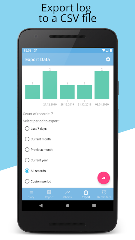* صادرات داده ها به یک فایل CSV، که بعد از آن شما می توانید به اشتراک بگذارید - برای مثال با دکتر خود.
