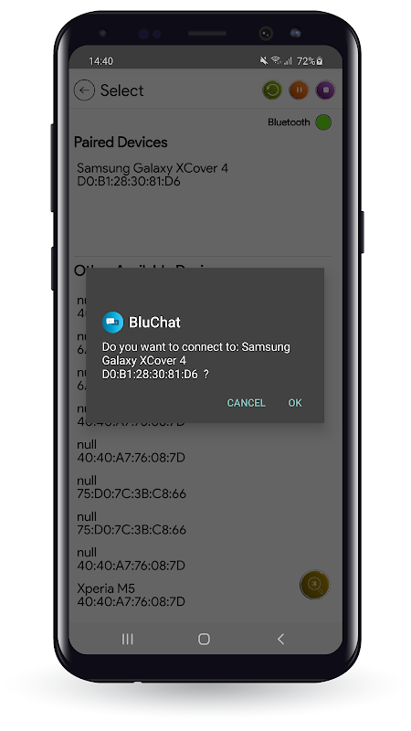 - While using BluChat, if there is problem when you send files to your partner's device, try to refresh your Bluetooth some times.