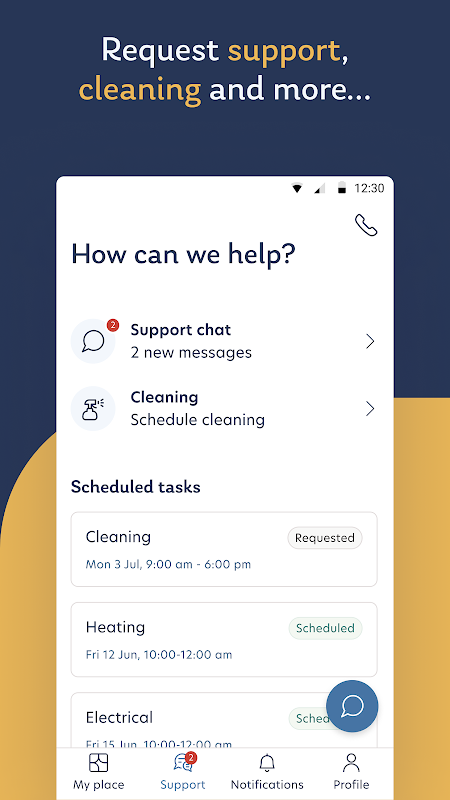 هر آنچه ممکن است نیاز داشته باشید، فقط از طریق برنامه درخواست دهید و تیم ما در اسرع وقت پاسخ خواهد داد. به عنوان مثال، زمانی که می خواهید برای نظافت آپارتمان برنامه ریزی کنید، یا زمانی که یک مشکل نگهداری وجود دارد که نیاز به توجه ما دارد. هر زمان که یکی از درخواستها یا گزارشهای شما بهروزرسانی شود، به شما اطلاع داده میشود.