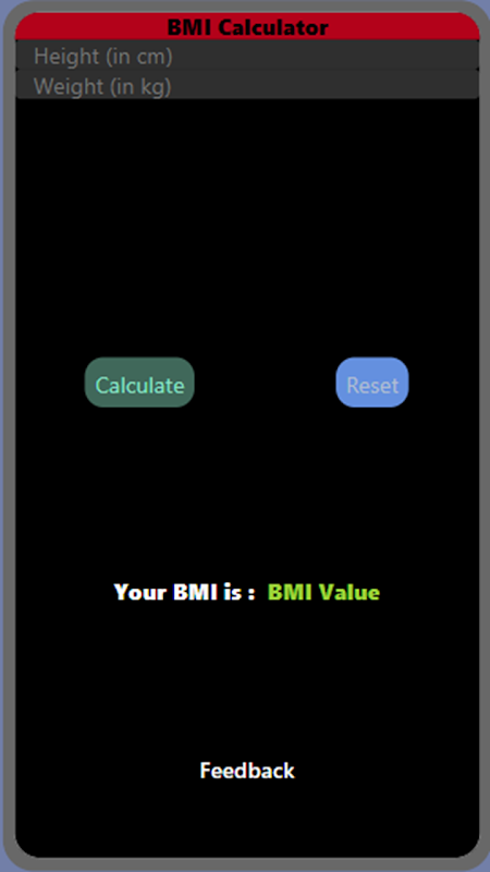 این برنامه نمیتواند اعداد منفی، صفر یا مقادیر غیر متنی را برای ورودی ارتفاع / وزن بپذیرد. اگر خطاها وارد شوند نمایش داده می شوند.