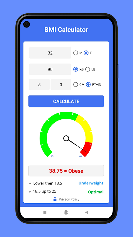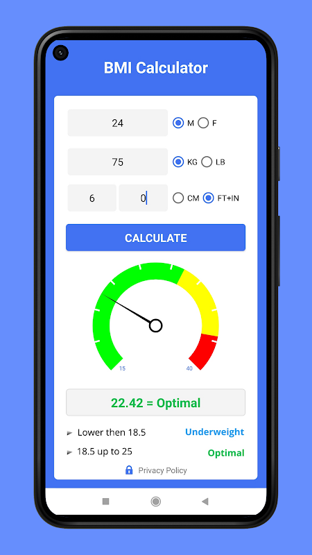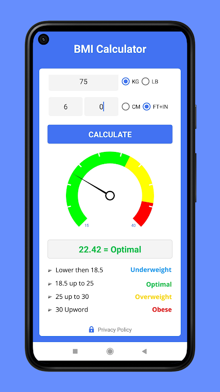 به برنامه نهایی BMI Calculator، ابزار اصلی شما برای ردیابی سلامت و تناسب اندام خوش آمدید! با وارد کردن وزن، قد، سن و جنسیت، به راحتی شاخص توده بدنی (BMI) خود را محاسبه کنید. در مورد آمار بدن خود مطلع شوید و وزن ایده آل خود را برای حمایت از سفر سلامتی خود کشف کنید. چه قصد کاهش وزن، حفظ یک سبک زندگی سالم، یا نظارت بر خطرات بالقوه سلامتی مانند چاقی، فشار خون بالا، بیماری قلبی یا دیابت را داشته باشید، برنامه ما شما را تحت پوشش قرار می دهد.