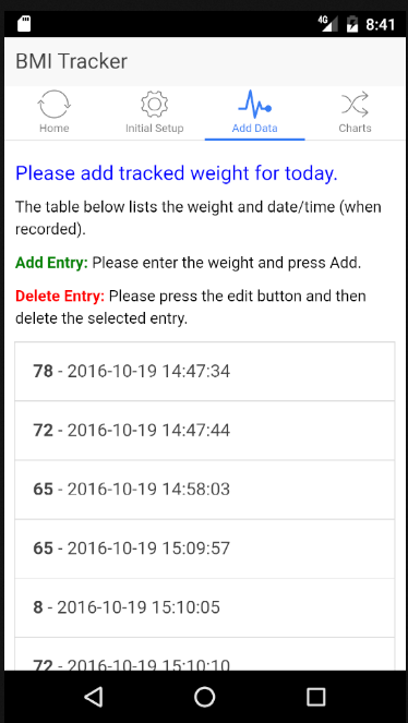 نرم افزار به شما کمک میکند وزن و BMI خود را پیگیری به صورت روزانه (شما می توانید مشخصات خود را به روز رسانی هر زمان که شما وزن خود را). این یک راه بسیار Lite از ردیابی BMI خود را پس از آن رژیم ورزش خود را پیشرفت است.