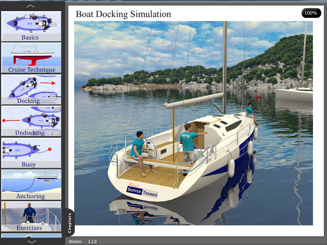 For example, various possible docking techniques are presented and explained. In addition to the basics such as boat types, leeway, prop walk (wheel effect), also common rookie mistakes are presented and explained. This is perfectly suited for presentation purposes.