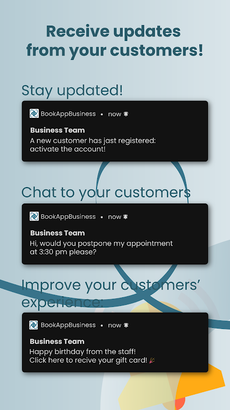 BookApp Business به مشتریان شما امکان می دهد بدون زحمت رزرو کنند و به شما امکان می دهد بدون دریافت تماس تلفنی همیشه کار کنید. ساده است: سیستم مدیریت را دانلود کنید، ثبت نام کنید و مراحل مورد نیاز را دنبال کنید. سپس شما آماده دریافت قرار ملاقات در هر نقطه، از طریق کامپیوتر، تبلت یا گوشی هوشمند خواهید بود!