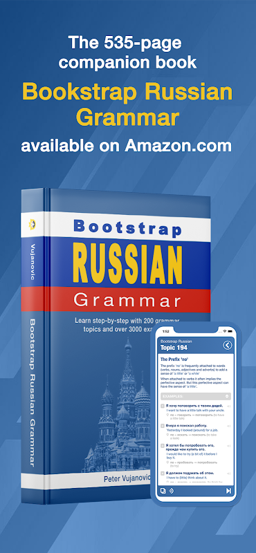 اکنون یک کتاب همراه به نام "BootStrap Russian Grammar" در دسترس است. این کتاب شامل تمام محتوای موجود در این کتاب است - از جمله 200 موضوع دستور زبان و بیش از 3000 عبارت مثال.