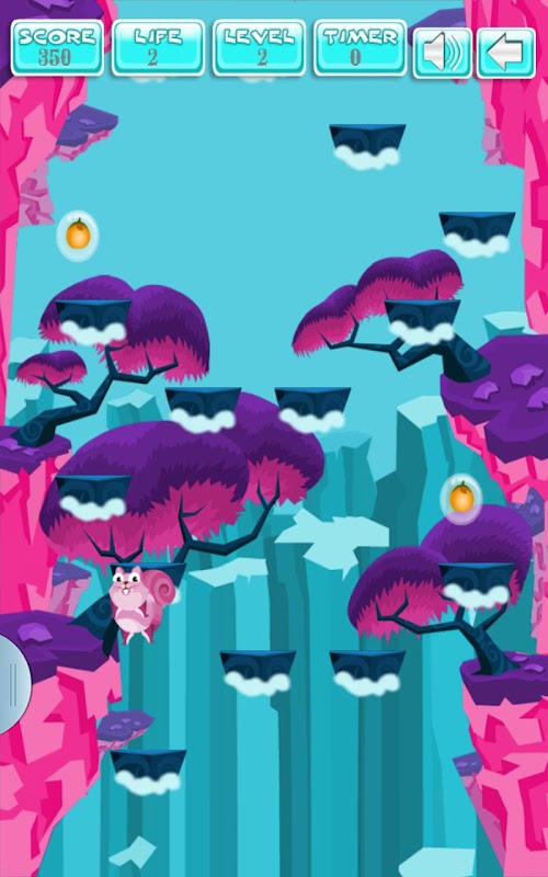 Bouncy Squirrel is super excited. Help him to collect the fruits and reach the sky. Squirrel can jump through the platforms and pick the fruits. He will lose the life if fall down from any platform. Squirrel can jump higher if touch on the screen while he jumps and accelerometer can be used for sidewise moves.