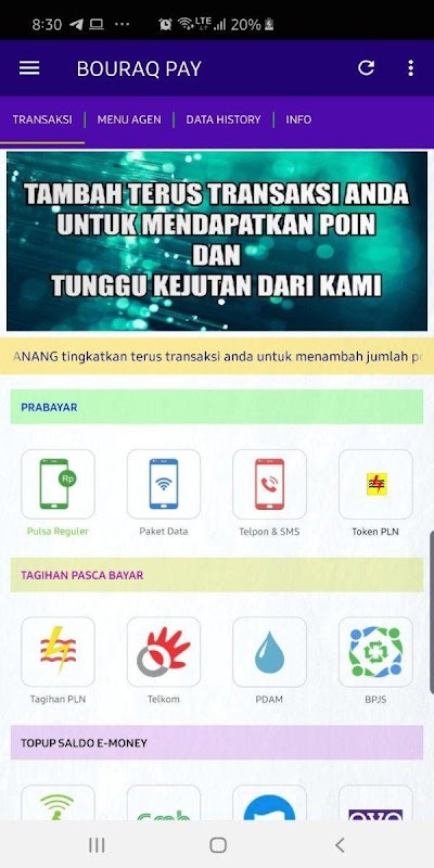 BOURAQ PAY android application is a free mobile application for loyal members of BOURAQ PAY wherever located. This application makes it easy for you to perform various transactions such as topping up pulses, purchasing electricity tokens, paying postpaid bills, purchasing game vouchers, etc.