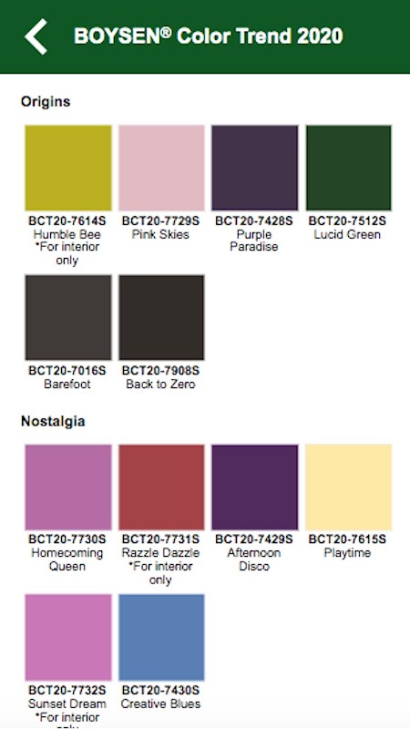 مشاهده رنگ که دوست دارید؟ یک عکس با استفاده از قابلیت رنگ ضبط و فورا دریافت نزدیک ترین بازی رنگ از همه موجود Boysen نمونه رنگ موجود در نرم افزار.