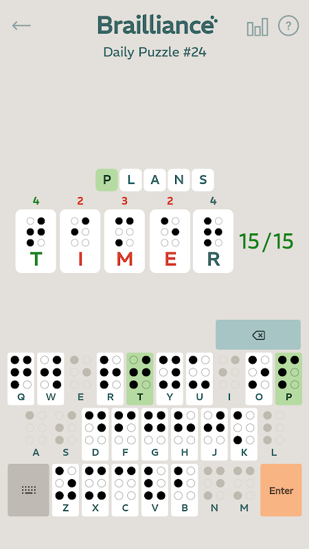 یک اسکرین شات از Brailliance، که در آن بازیکن یک S را برای تشکیل کلمه W-O-R-D-S اضافه کرده است. با این کار تا 17 نقطه بریل اضافه می شود. حروف صحیح سبز می شوند و زنگ می زنند.