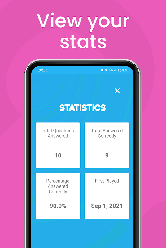 - شما صفحه آمار سفارشی خود را دارید که نشان می دهد به چند س questionsال پاسخ داده اید ، به چند سوال درست رسیده اید و مدت زمانی است که برنامه مسابقه ما را بازی می کنید.