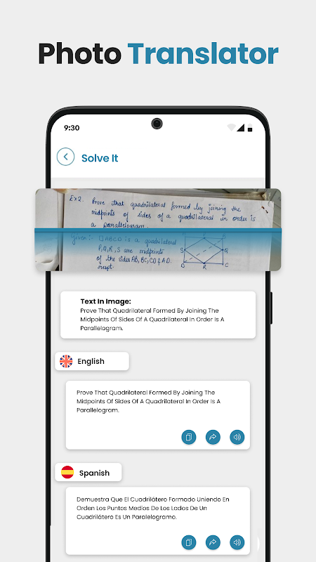 این برنامه همچنین دارای یک ویژگی است که Photo Translator است. با ترجمه عکس می توانید به سادگی از هر متنی عکس بگیرید و ترجمه های فوری به زبان دلخواه خود دریافت کنید. ابزار Scan and Translate برای ترجمه هر متنی از یک تصویر یکپارچه کار می کند. این مترجم عکس قدرتمند برای مسافران، دانشآموزان یا هر کسی که به دنبال شکستن موانع زبان است، مناسب است.