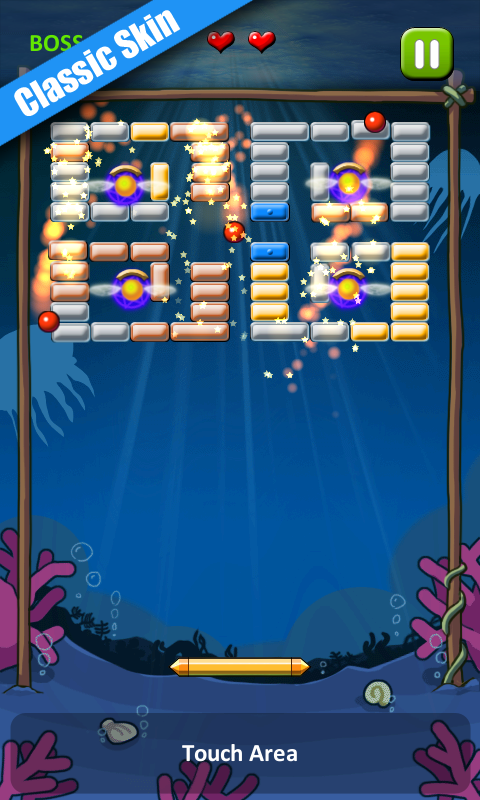 Familiar to play, yet hard to master, Break Bricks brings fresh challenges and unanticipated obstacles to breakout hunter age players around the world. In this entrancing game of skill and spatial awareness, it is your job to destroy all the bricks. By using the walls and the paddle below, try your best to ricochet the ball against the bricks and knock down them to extinction. Watch out the challenging bosses (temple shape, dino shape & etc.) every 30 levels.