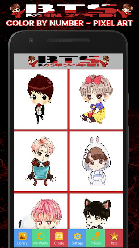 BTS Army Chibi Color By Number - Pixel Art Coloring is the free painting and drawing App for all fans BTS Army and BTS Chibi, nice chose for adults.