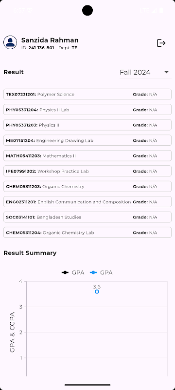 • عملکرد تحصیلی: به میانگین نمرات تجمعی (CGPA) خود دسترسی داشته باشید و گزارش های دقیق نمرات را بررسی کنید تا پیشرفت تحصیلی خود را در طول زمان پیگیری کنید.
