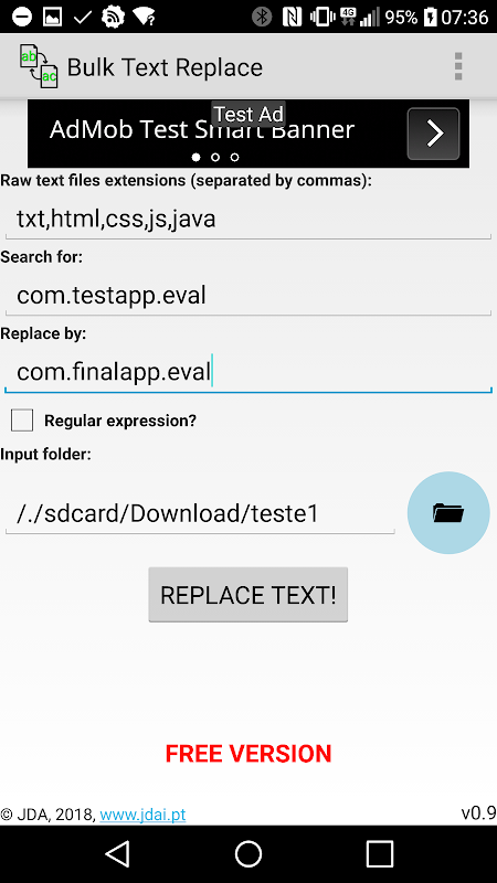 نسخه رایگان جایگزین متن حداکثر 5 فایل در یک بار. نسخه حق بیمه حذف این محدودیت و همچنین حذف تمام تبلیغات از برنامه است.