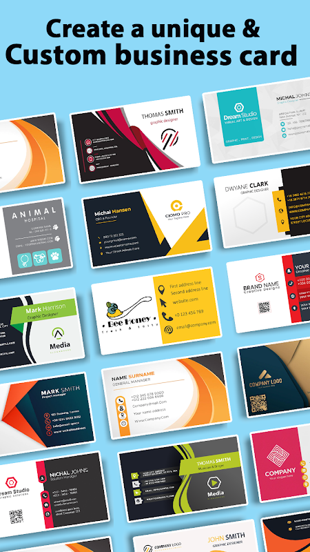 اپلیکیشن سازنده کارت ویزیت دارای 100 طرح خلاقانه است. طرح های گرافیکی ساخته شده با طراح کارت ویزیت شبیه کارت ویزیت است که توسط طراح گرافیک حرفه ای ایجاد شده است.