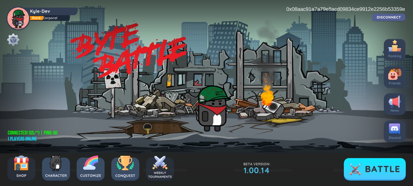 Byte Battle یک بازی مرورگر PvP رایگان است که دارای نقشههایی به سبک پلتفرمر است که در آن بازیکنان با شخصیتهای قابل تنظیم با استفاده از مکانیکهای تیراندازی متعدد برای غلبه بر حریفان خود مبارزه میکنند. بازی Byte Battle یک میدان نبرد جدید برای NFT Universe است که در آن گیمرها می توانند برای سرگرمی بازی کنند و در مسابقات رقابتی شرکت کنند تا جوایز نقدی را از طریق مکانیک های جدید رقابت برای کسب به دست آورند.
