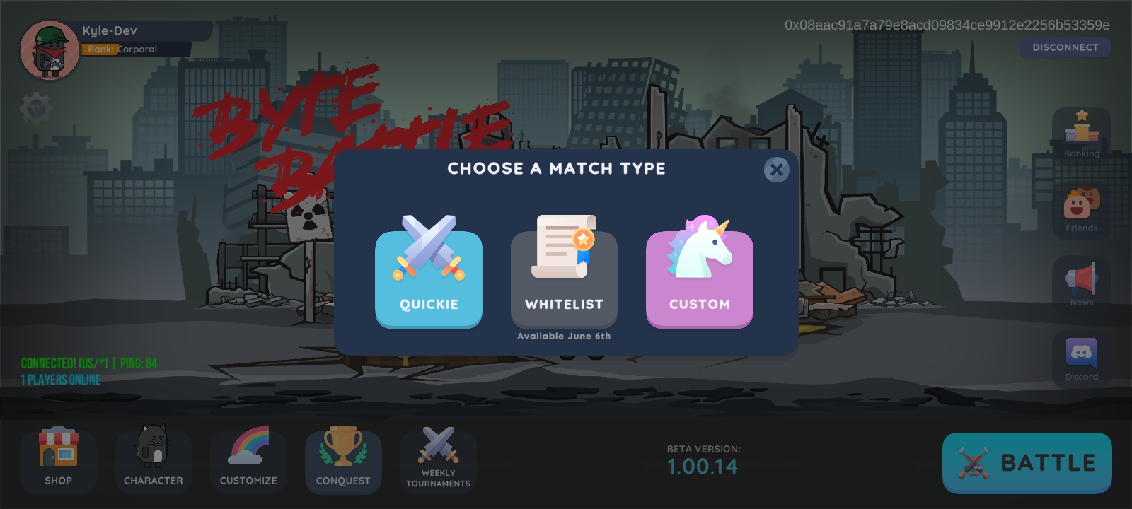 بازی Byte Battle رایگان است (F2P) و هر کسی که دارای مرورگر دسکتاپ یا دستگاه تلفن همراه اندروید باشد می تواند آن را بازی کند. محدودیتهای فعلی سیستم F2P شامل ایجاد/پیوستن به مسابقات لیست سفید و مسابقات هفتگی Player-And-Earn (P&E) است. اطلاعات بیشتر در مورد انواع تطابق بعداً.
