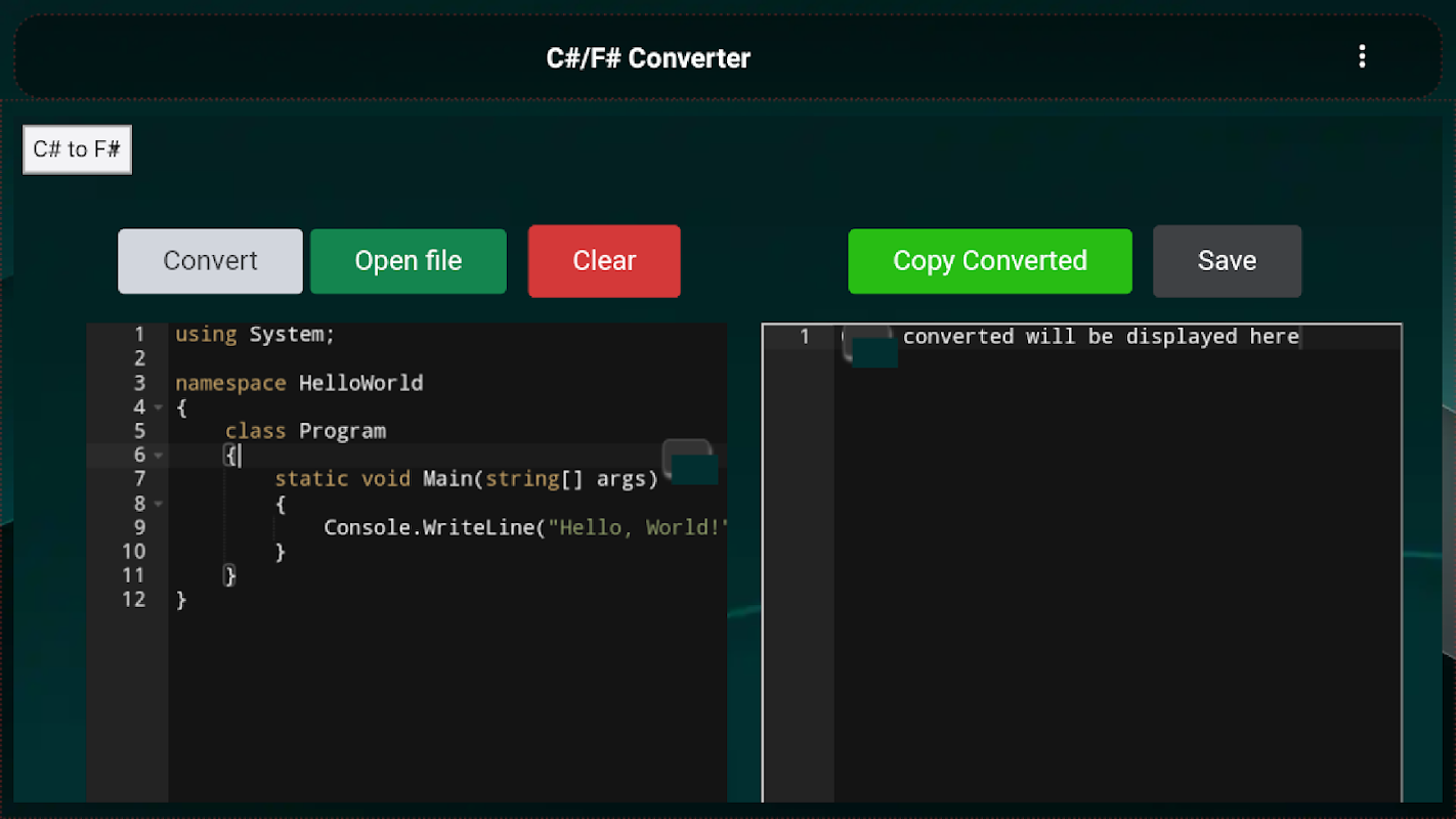 مبدل کد C# به F# و F# به C#. کامپایلر سی شارپ نیز گنجانده شده است.