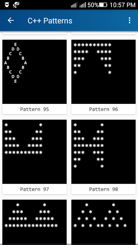 App contain C++ codes for generating different patterns (e.g. ASCII arts, pyramid) which is useful to study stuff related to C++ programming.