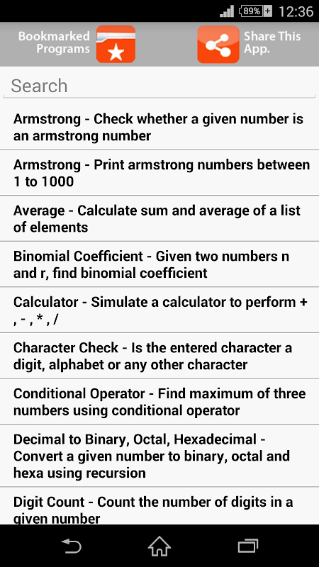 This app contains around 100 C Programs (with Outputs) that are frequently asked in college exams or job interviews. Enjoy features like Offline downloading of programs, sharing programs, bookmarking and lots more.
