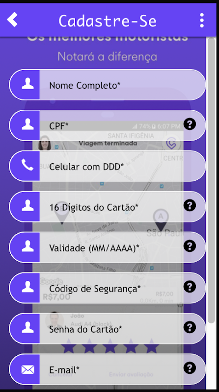 Com apenas alguns cliques no app, você poderá solicitar um trajeto. E em apenas alguns minutos, terá à sua disposição um veículo que levará você aonde quiser. Tudo isso com altos padrões de segurança.