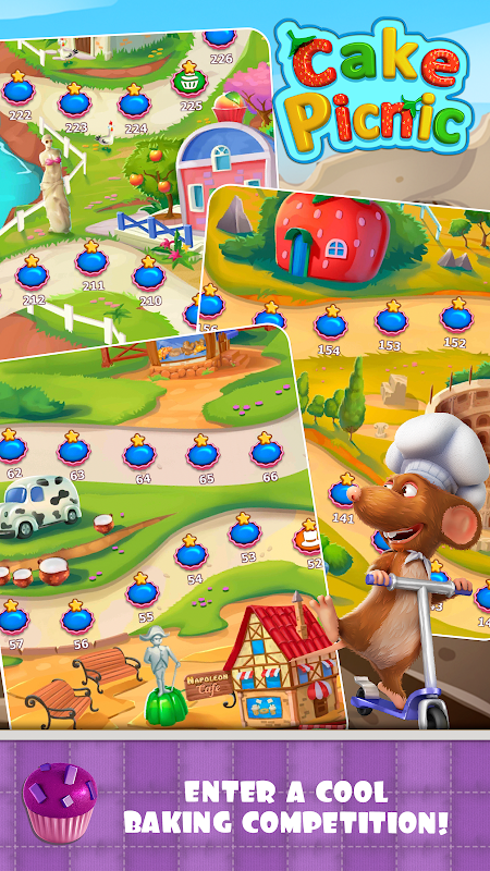 Embark on a mouth-watering match-3 picnic! Drive your bakehouse-on-wheels through gourmet lands and serve all kinds of sweet desserts. We’ve got the most exquisite three-in-a-row challenges, the best baking ingredients for you to collect, and unforgettable non-culinary tasks to tease your brain!